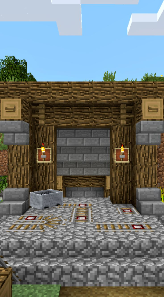 A little bit later than the lighthouse, I built a mineshaft. It goes all the way from 64 to -64, and has decorative walls, with a minecart track down the middle.